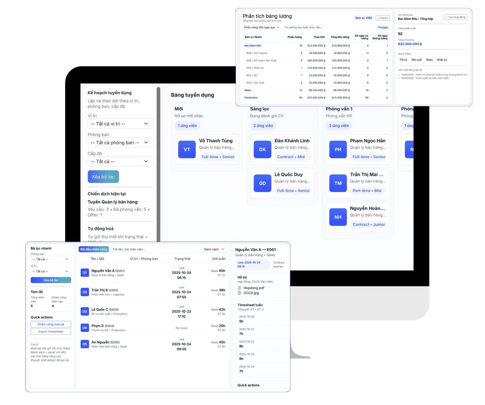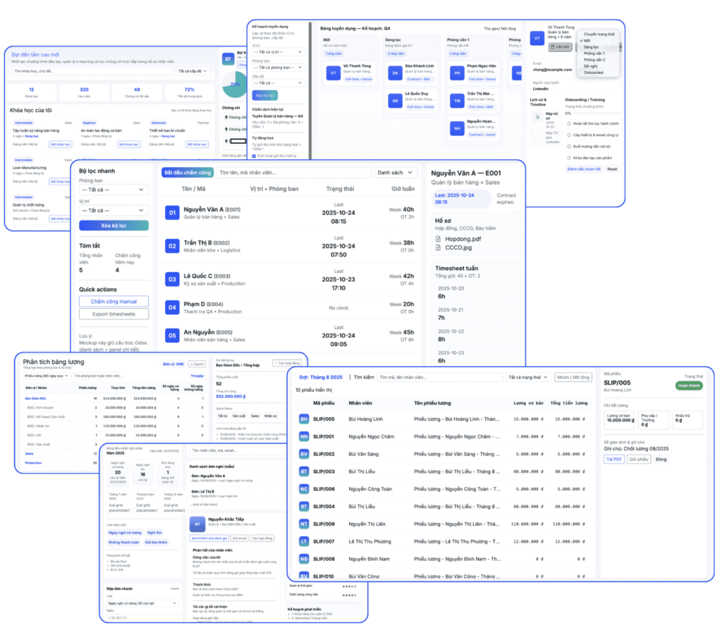 • Lưu trữ hồ sơ nhân viên, hợp đồng, khen thưởng; chấm công; quản lý ca – kíp, nghỉ phép, OT và đồng bộ trực tiếp vào bảng lương.